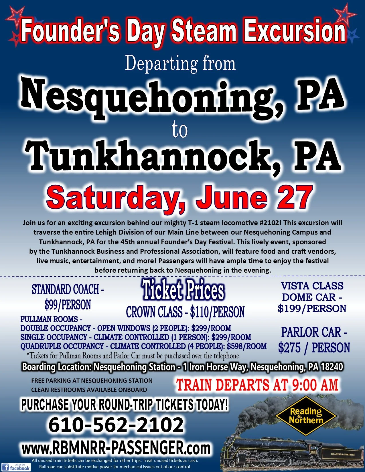 *Tickets for Parlor Car and Pullman Rooms must be purchased over the phone by calling 610.562.2102*