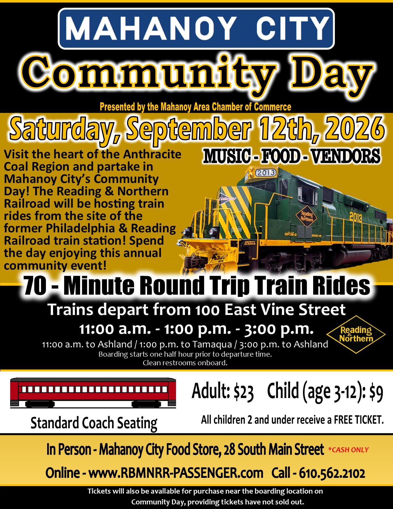 Join us on Saturday, September 12th in Mahanoy City, PA for their Community Day celebration! The Reading & Northern will be operating train rides as a part of the day’s festivities. Trains will depart from downtown Mahanoy City at 11:00am, 1:00pm, and 3:00pm.