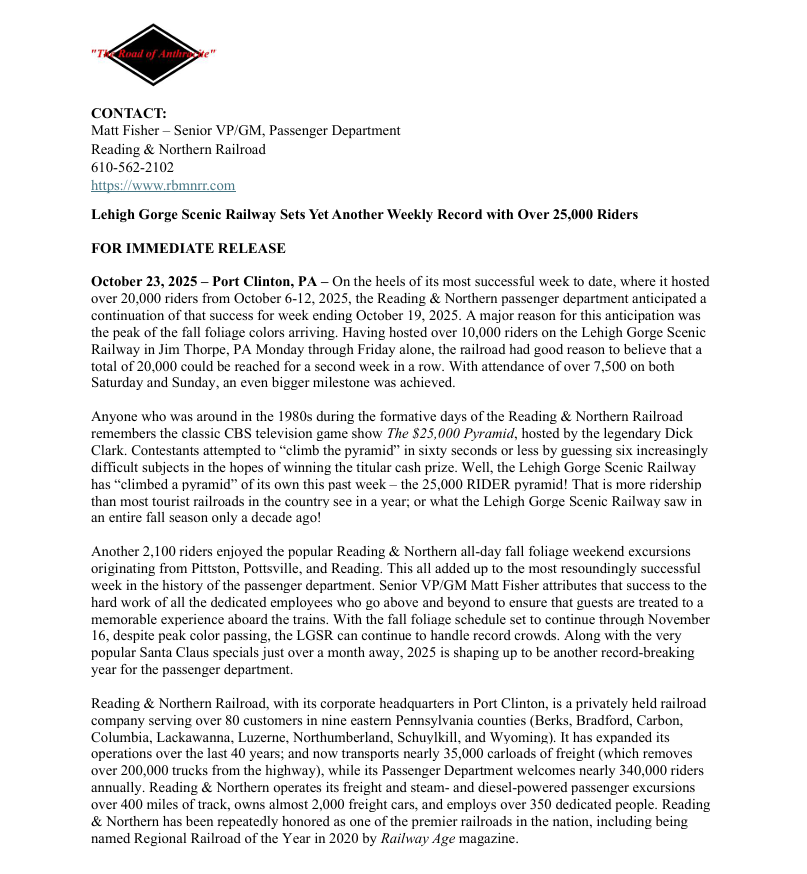 Lehigh Gorge Scenic Railway Sets Yet Another Weekly Record with Over 25,000 Riders View fullsize Against a backdrop of peak fall colors, an LGSR train discharges its passengers while the next group eagerly awaits boarding. Matt LiptakOctober 23, 2025 Facebook0 Twitter LinkedIn0 Reddit 0 Likes