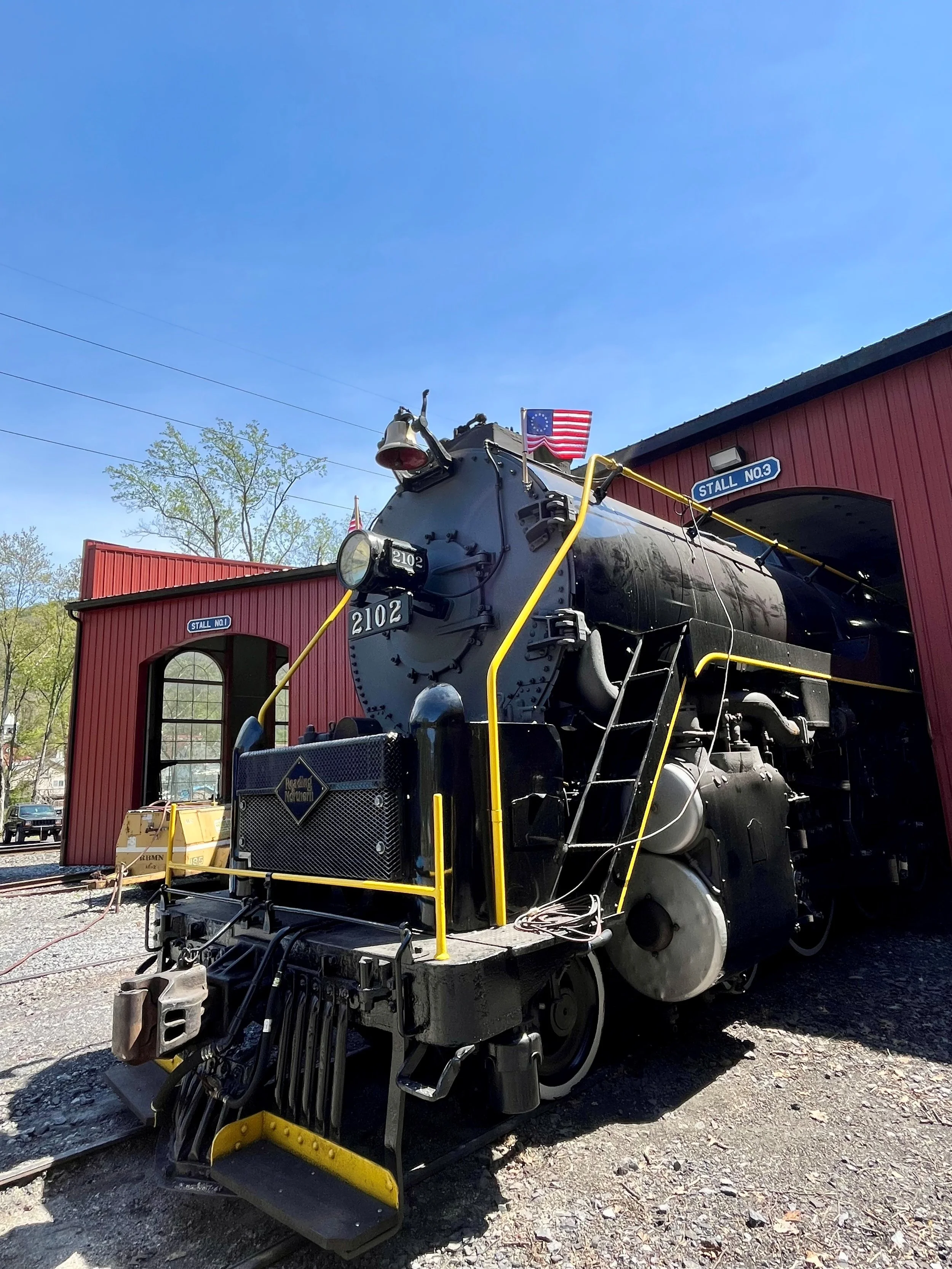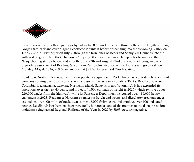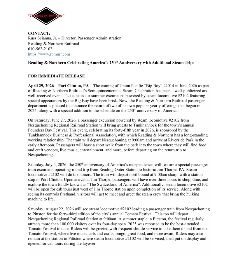 Reading & Northern Celebrating America’s 250th Anniversary with Additional Steam Trips View fullsize Steam locomotive #2102 basks in the sun outside the Port Clinton roundhouse with Betsy Ross flags waving. Matt LiptakApril 29, 2026 Facebook0 Twitter LinkedIn0 Reddit 0 Likes
