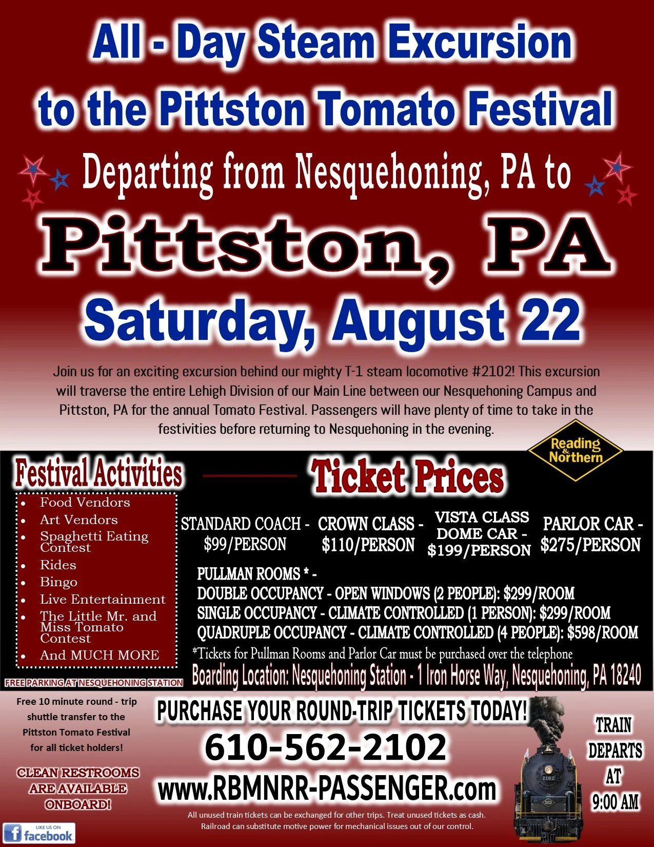 Join us for an exciting excursion behind our mighty T-1 steam locomotive #2102! This excursion will traverse the entire Lehigh Division of our Main Line between our Nesquehoning Campus and Pittston, PA for the 43rd annual Tomato Festival. This one-of-a-kind event features great food (including a spaghetti eating contest), rides, bingo, live entertainment, and the Little Mr. and Miss Tomato contests. Passengers will have plenty of time to take in the festivities before returning to Nesquehoning in the evening.
